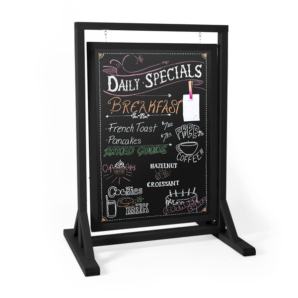 - BUILT TO LAST – With a heavy weight wooden frame, sturdy hanging chalkboard surface, and durable design this sandwich board sign will withstand winds and last for years.