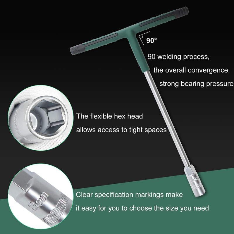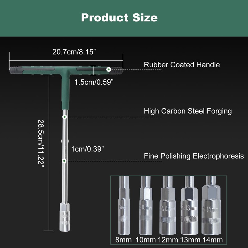 - Package includes: The T-handle socket wrench set includes five essential metric sizes (8mm, 10mm, 12mm, 13mm, and 14mm), perfect for accessing hard-to-reach areas during repairs.