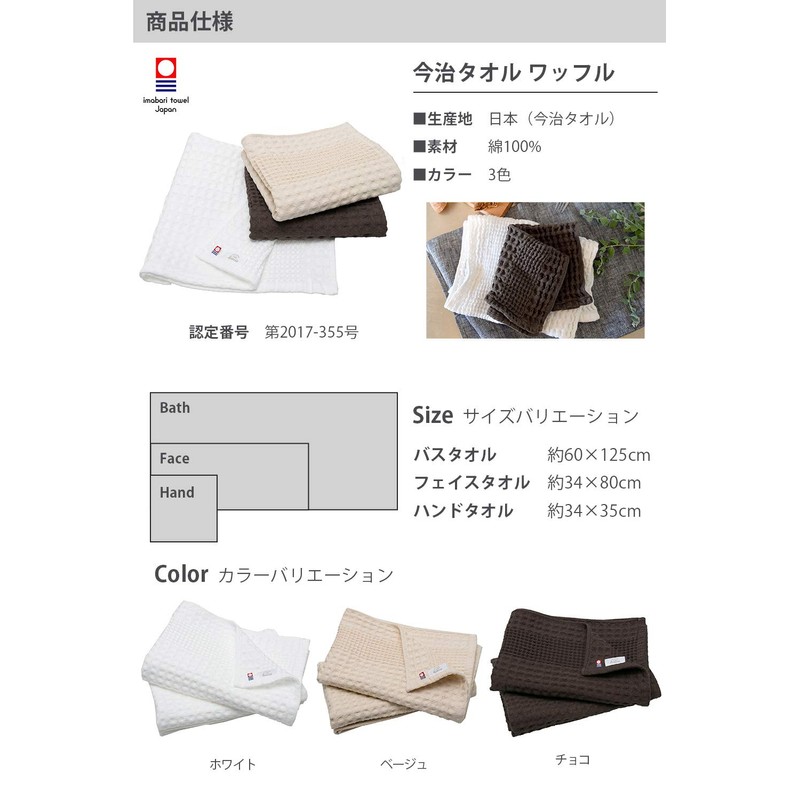- (Bath Towel Set of 2) Country of Origin: Japan (Imabari Towels, Certification Number: No. 2017-355) Material: 100% Cotton; Size and Weight: Approx. 23.6 x 49.2 inches (60 x 125 cm); Approx. 8.9 oz (227 g); Color: White, Beige, Chocolate)
