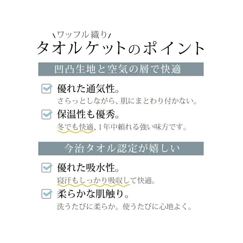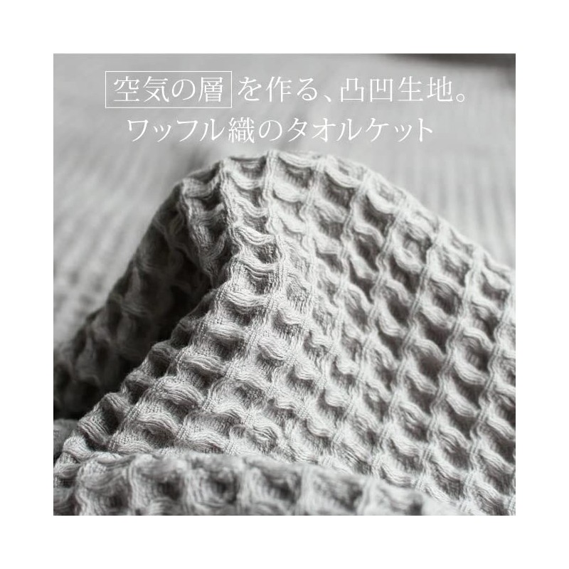 The three-dimensional weave creates a stylish waffle weave. In fact, it is also functional. At first glance, it feels thin, but the uneven parts contain air to keep you warm, and it won't stick to your body for comfort. The textured texture allows for breathability and freshness. It has a simple and casual presence, so it is recommended for use in living rooms. Many people use it as a sofa cover, it is lightweight and compact, so it is easy to carry, so it can be used for a variety of occasions such as naps or sleeping in the car. Imabari Towel Brand Certification Number: Imabari quality enriches your life.