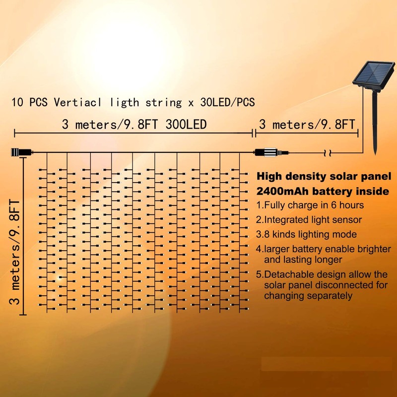 - Higher Waterproof & Detachable Design: Our Solar Curtain Lights adopt the advanced technology which increases the safety of voltage operation to a large degree, and there is no worry about exposing the lights to the RAIN OR WATER! Detachable design make it possible to take the solar panel outside for charge separately, save the hassle of deal with the main light for hanging every time