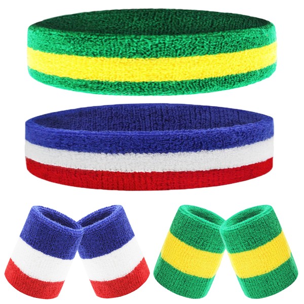 IMAGERIO 6 Pieces Sweatband Set Sports Headband Wristband Set, Moisture Wicking Sweatbands 4 Wrist Sweatband and 2 Headbands, Sweat Absorbing Head Band for Workout -(Red/White/Blue+Green/Yellow/Green)