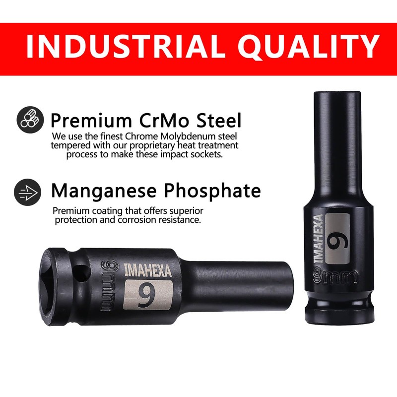IMAHEXA 1/2 - Inch Drive 9mm Metric Deep Impact Socket with Anti - Rounding 6 - Point Design, Made of Cr - Mo Steel for Deep Impact Applications