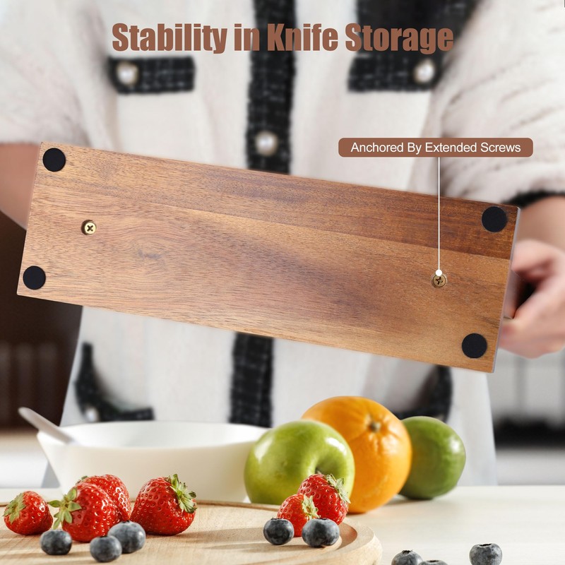 • Natural Acacia Wood Magnetic Knife Block: The wooden knife holder is crafted from premium acacia wood, renowned for its durability. The wood is resistant to cracking and features a beautiful natural grain that adds an elegant touch to your kitchen. The smooth surface of the universal knife block ensures your knives remain securely in place while helping to maintain their sharp edges