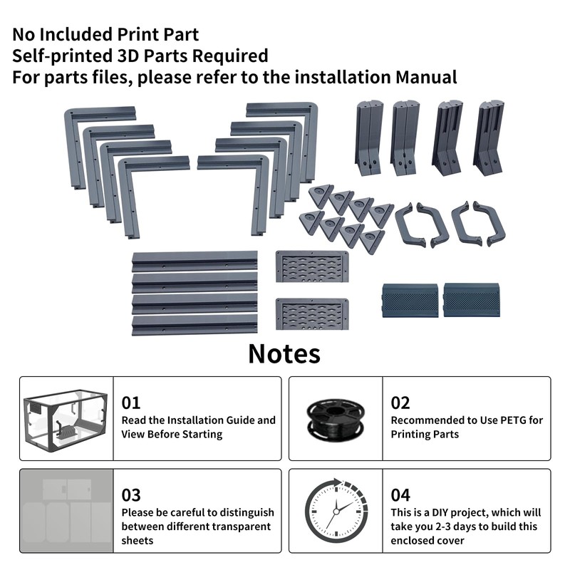 • Note: The AMS lite enclosure kit is unassembled and does not include prints. You need to download the STL file according to our guide and print it by yourself, PETG filament is recommended. Please confirm before purchasing that this is a DIY project, which will take you 2-3 days to build this enclosed cover