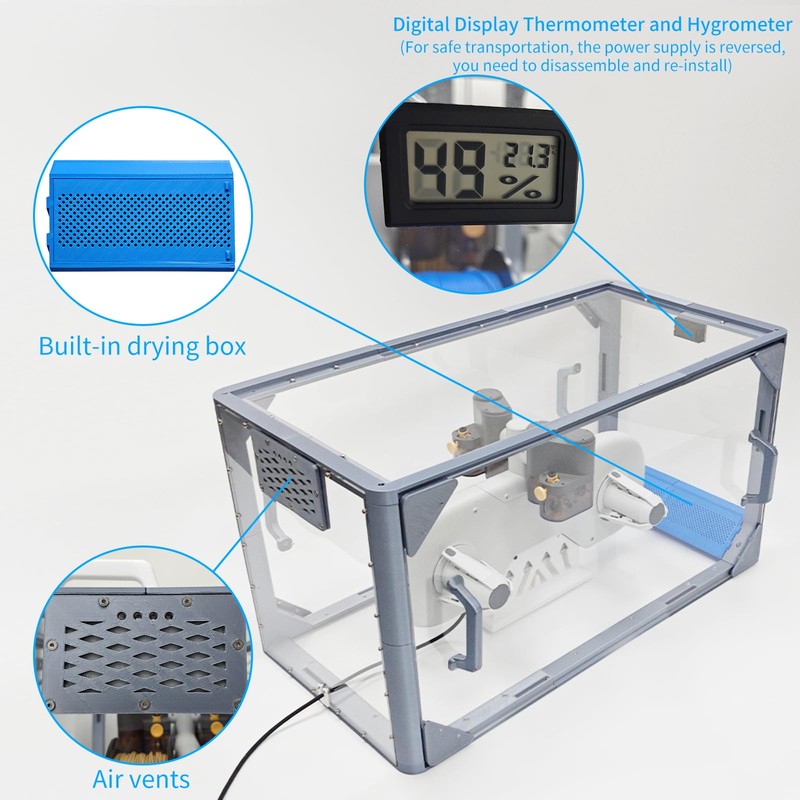 • Equipped with a t ransparent enclosure sheets, allowing users to easily view material status. Features a built-in dry-box for active dehumidification during operation. Includes a digital display thermometer and hygrometer for real-time tracking of temperature and humidity inside the enclosure. No air filter