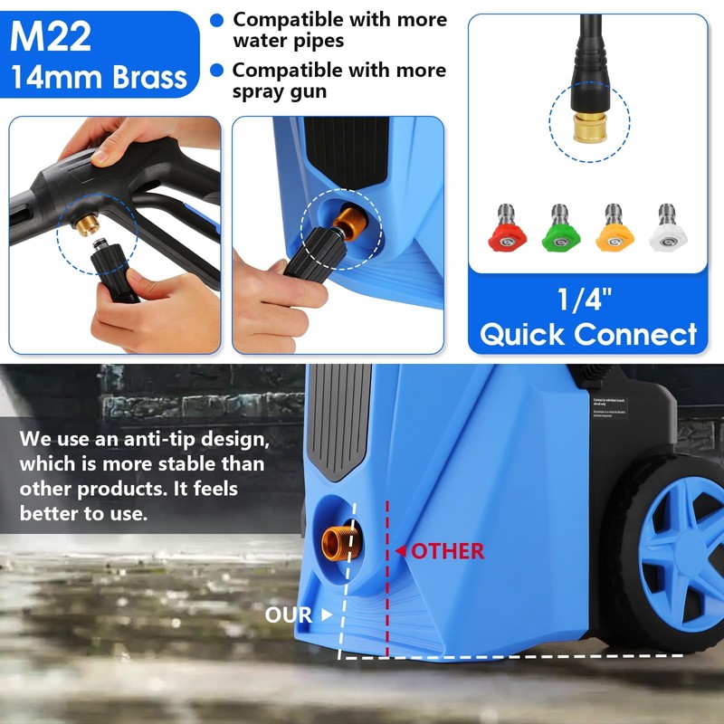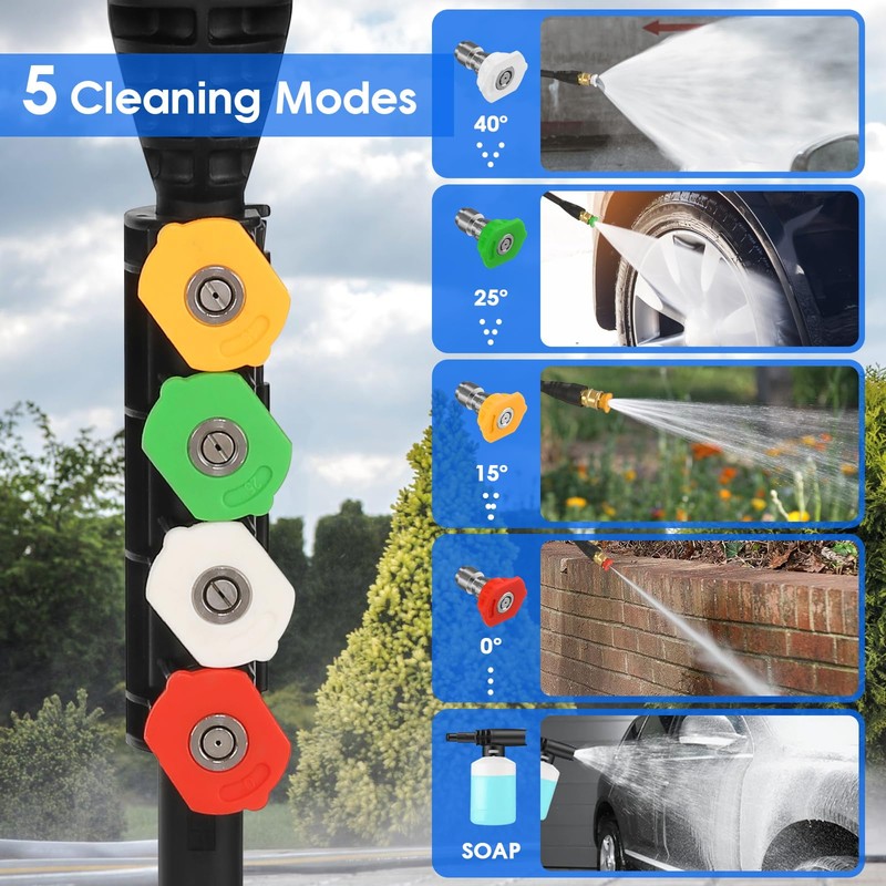 - **[Versatile Cleaning Solutions]** Equipped with four universal quick-connect nozzles (0°, 15°, 25°, 40°), turbine nozzles, and an advanced 500ml foam gun, this pressure washer can handle a wide range of cleaning tasks. Users can adjust the pressure settings to suit their specific cleaning needs. The foam cannon produces thick, dense foam, ideal for professional-grade car washes and effectively cleaning even the dirtiest surfaces.