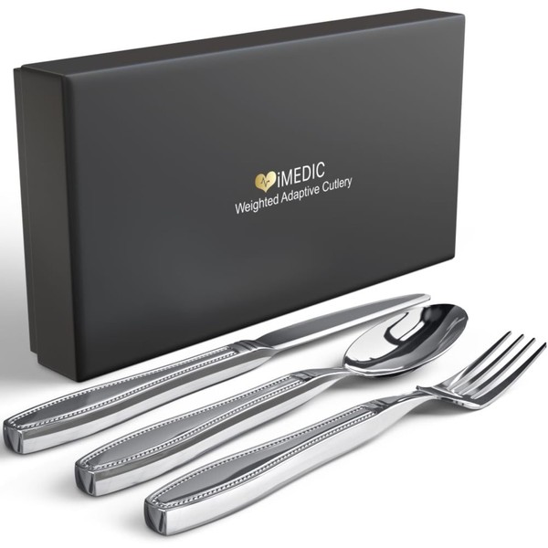 IMedic Weighted Utensils for Hand Tremors - 3-Piece Adaptive Utensils with Gift Box - Weighted Silverware for Hand Tremors - Weighted Silverware for Parkinsons