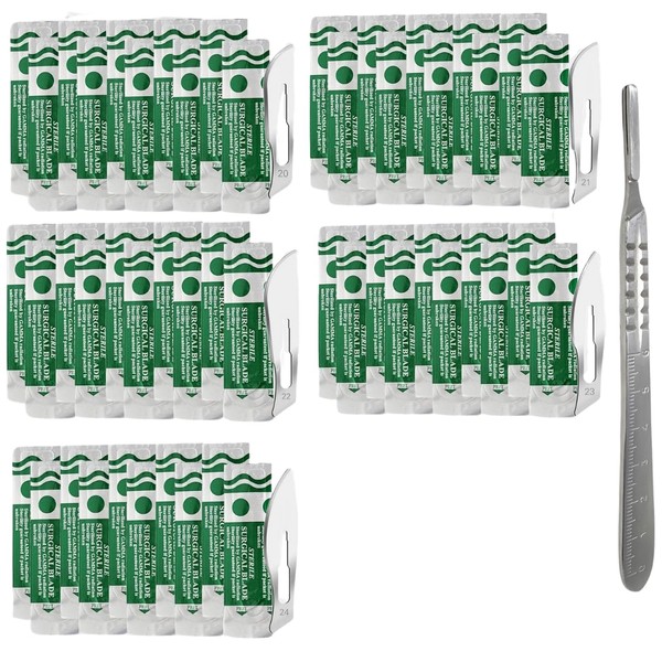 • ✅ Package includes an assortment of 50 Pcs Disposable Blades #20 #21 #22 #23 and #24. This kit also includes a stainless steel reusable scalpel handle #4 with etched metric scales.
