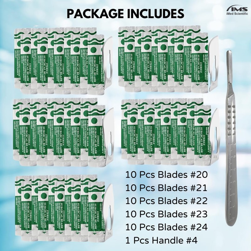 Package includes an assortment of 50 Pcs Disposable Blades #20 #21 #22 #23 and #24. This kit also includes a stainless steel reusable scalpel handle #4 with etched metric scales.