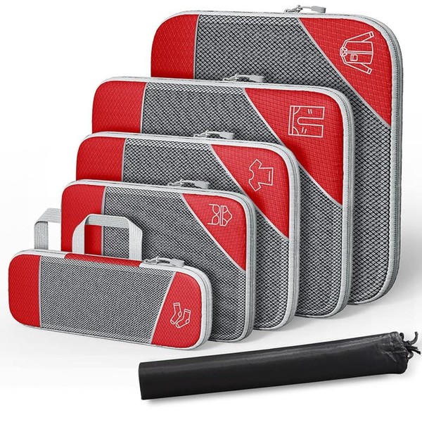 IMIFUN Compression Packing Cubes, Extensible Storage Mesh Bags Organizers - L+M+S+XS+Slim+Laundry Bag (Red)