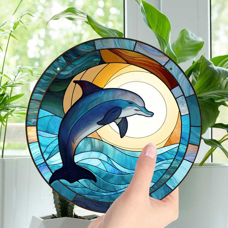 - 🐬【wall dolphin ornament】🐬🐬🐬 Dolphin jumping moon wall hanging round stained acrylic window hanging hand painted sun catcher panel with metal chain home decor art gift for porch door