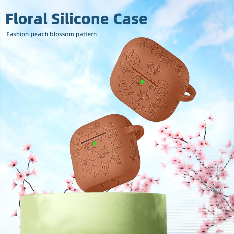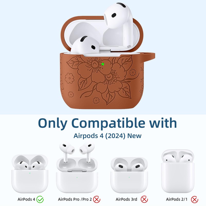 IMIVIO Floral Engraved Case for AirPods 4th Generation Case Cover 2024, Soft Silicone Protective Case for AirPods 4 Case for Women Men, for AirPod 4 Case Comes with Cleaner Kit, Keychain, Red Brown