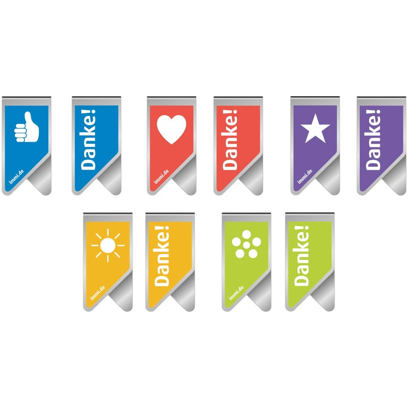 - Markclip 5 Coloured Wing Clips with the Signs of Thank You: Thumbs Up/Blue, Star/Purple, Heart/Red, Sun/Yellow, Flower/Green