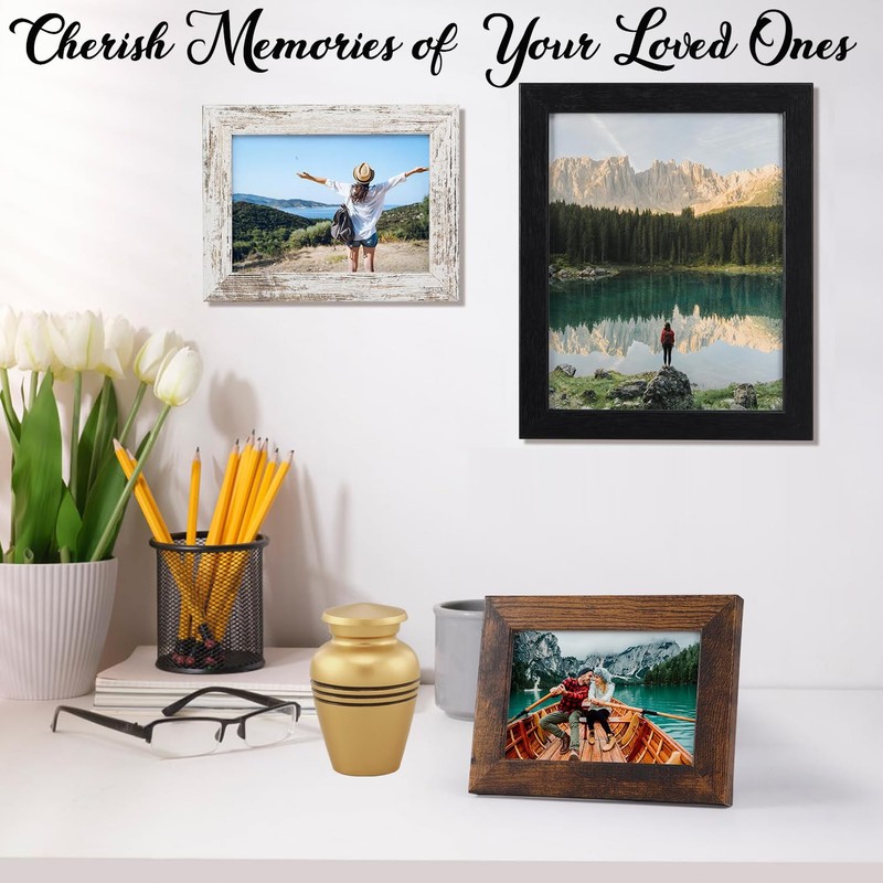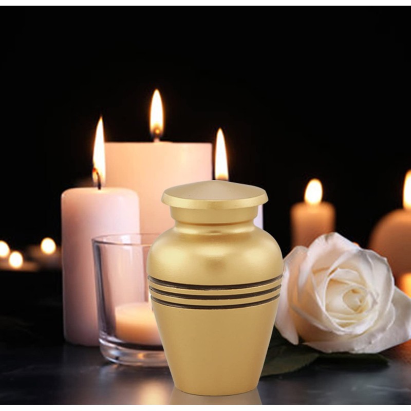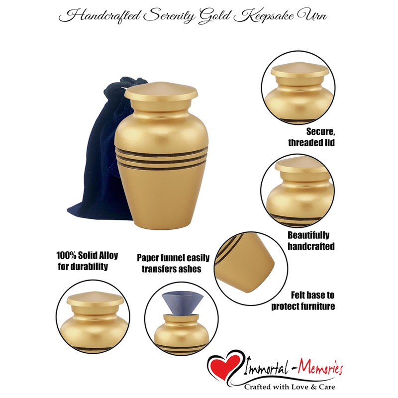 - Affordable Alloy Beautifully Handcrafted Serenity Gold Keepsake Urn with stripes. A Keepsake Urn is perfect for keeping a small memento of your loved one - such as soil or sand from a special location, a lock of hair, dried flower petals, a special note or a portion of cremation ashes. This keepsake fits nicely into the palm of your hand. A threaded lid enables ashes to be placed inside the urn and securely sealed and closed and the bottom of the urn is felted to protect your furniture.