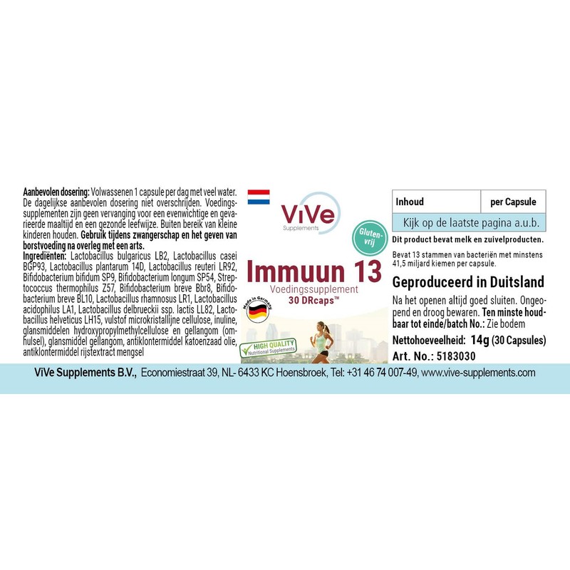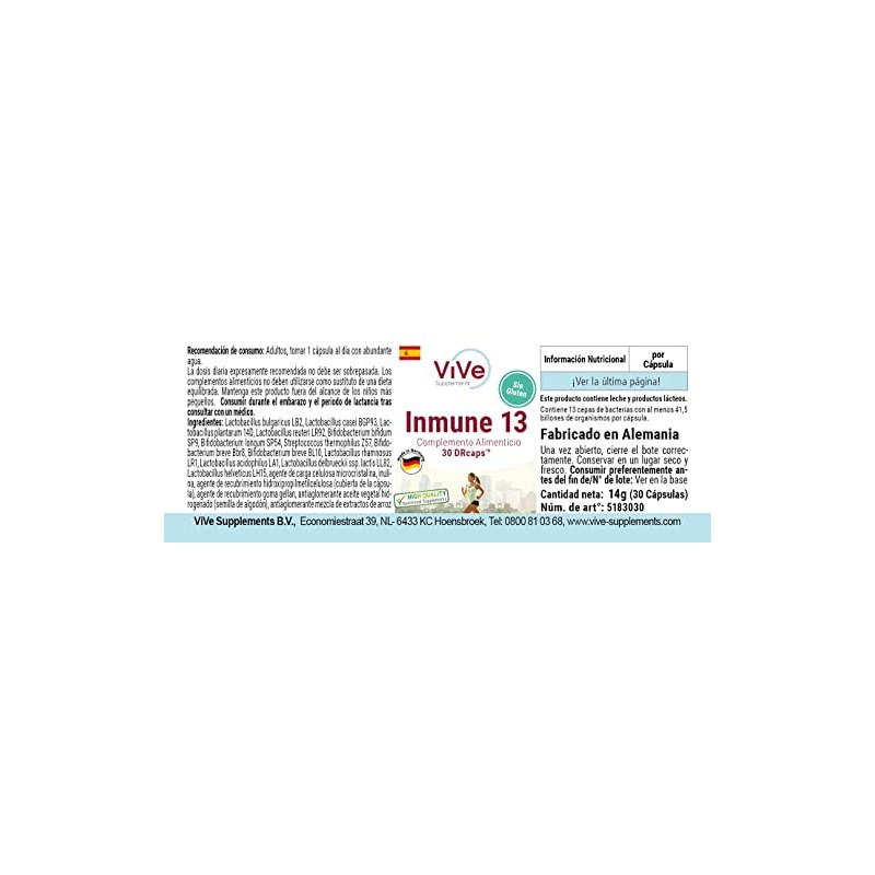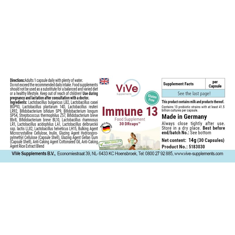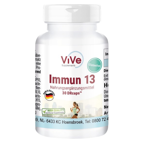 The Immune 13 dietary supplement from ViVe Supplements is a high-quality vital substance preparation that includes 13 strains of good bacterial cultures with at least 41.5 billion colony forming units.