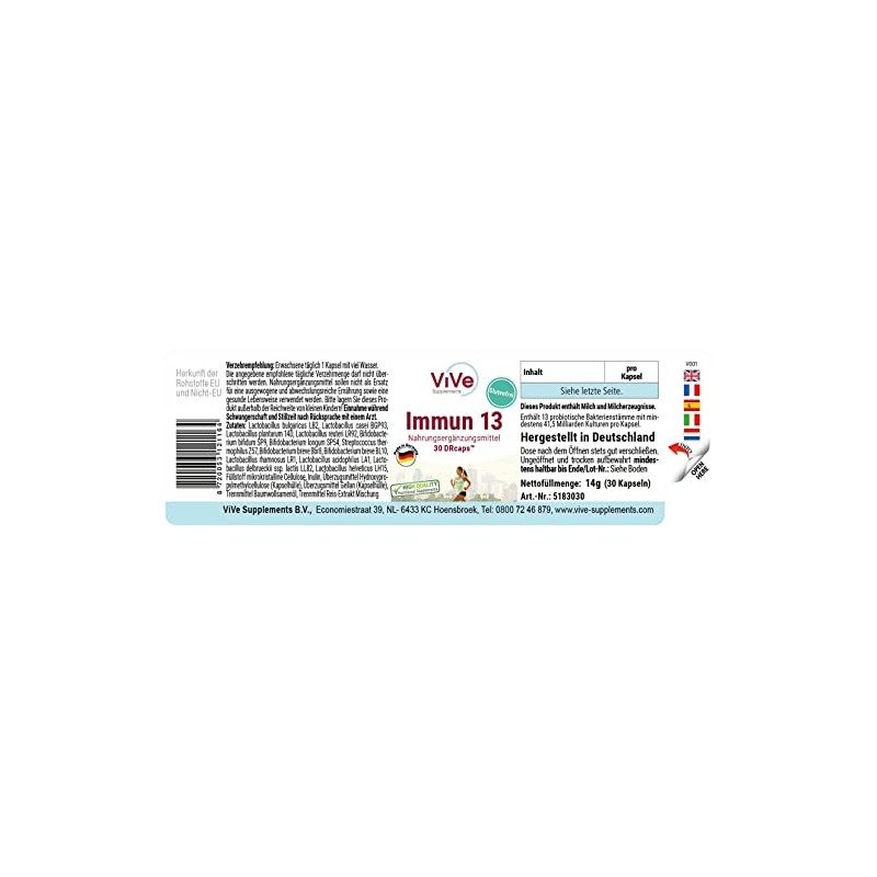 Immune 13 with Bacterial Cultures - 30 Time Delayed DRCaps - 13 Good Bacteria Strains & 41.5 Billion Colony Forming Units - High Dose | Quality from Germany by ViVe Supplements