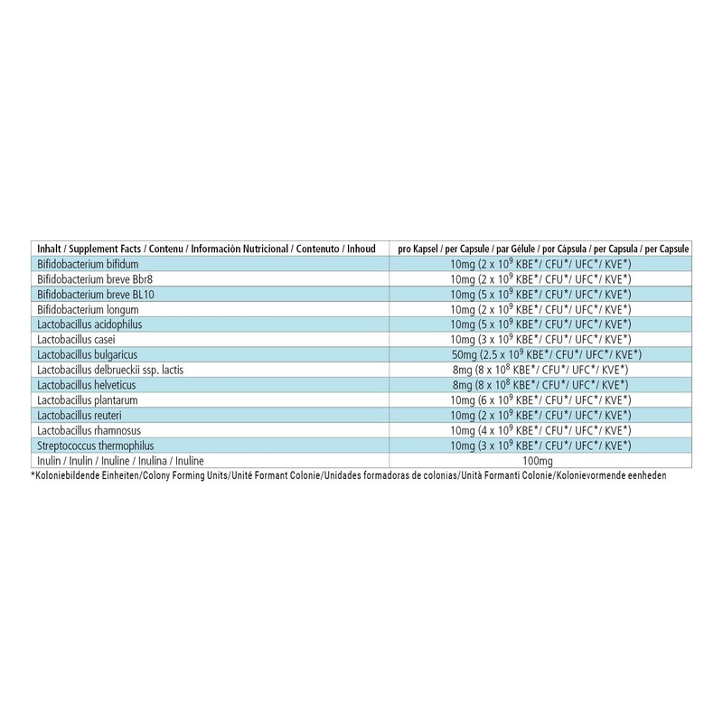 • ✔ Excellent value for money: 30 time-delayed DRCaps - bacterial cultures with 13 strains with at least 41.5 billion colony forming units. The daily consumption of 1 capsule includes 4 strains of bifidobacteria, 8 strains of lactobacilli, Streptococcus thermophilus and inulin. Regular intake: 1 capsule daily with plenty of water