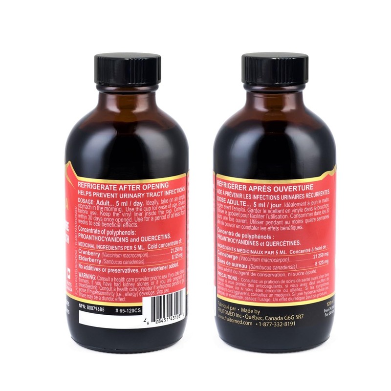 - MEDICINAL INGREDIENTS (per 5 ml: 29,375 mg of fruits): Canadian Cranberry concentrate (21,250 mg). Canadian Elderberry concentrate (8,125 mg). Highly concentrated extract through a cold process to preserve the polyphenols' antioxidant properties.