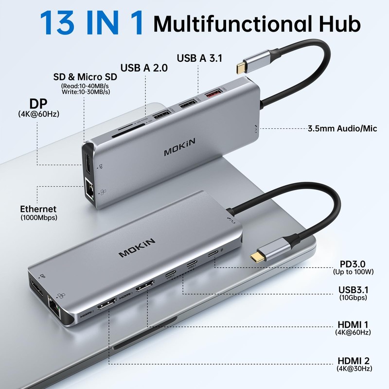 - 【13-in-1 USB C Docking Station】MOKIN Docking Station Dual Monitor comes with 2 x 4K HDMI, DP display ports, Gigabit Ethernet, 100W PD charging, 3 x 10Gbps USB 3.1 and 2 x USB 2.0 ports, SD&TF card reader, 3.5 mm audio and microphone 2-in-1. In addition, this 2 HDMI docking station does not require any driver installation and is plug-and-play for your daily use. If you're not sure about compatibility, we're happy to help. Note: In docking mode, macOS laptops can only be docked with one 4K@60Hz display. (The dock does not support the use of converters)