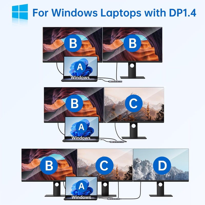 - 【Docking Station Dual HDMI DP】This docking station helps you to easily achieve the display of two or three monitors. Whether it is meetings, presentations or audio-visual entertainment, you can enjoy high-definition picture quality and an immersive experience. When the signal source is DP1.4, triple displays reach new heights, supporting up to 3 X 1080@60Hz. NOTE: In extended mode, macOS users can only extend one. If you have any questions about specifications such as resolution, we will be happy to help you