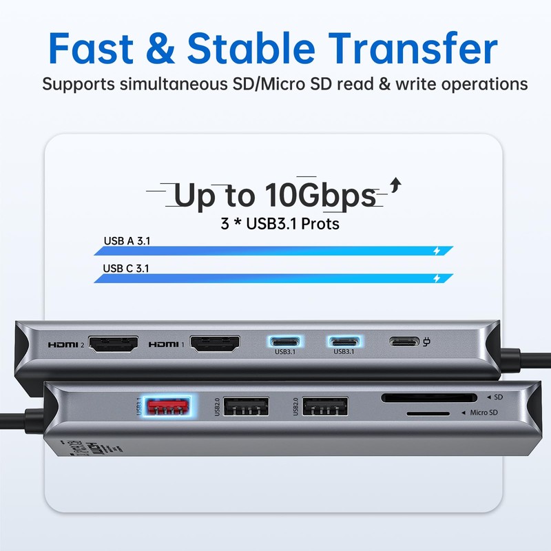 - 【Up to 10Gbps Speedy Transmission】:This triple monitor docking station comes with 2 USB C 3.1 & USB A 3.1 ports (up to 10Gbp/s) , USB 3.1 ports can transfer 20G files in 25 seconds. And 2 USB A 2.0 ports are best used for your mouse, keyboard and other low rate devices. Built-in SD and Micro SD slots support inserting two memory cards to read data at the same time. (PLEASE NOTE:Data transfer rates are subject to the speed of the memory)