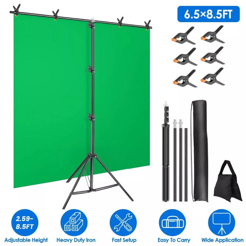 Looking for a portable backdrop stand for your photography or live streaming setup? Crafted from sturdy iron, this 6.5×8.5ft T shape backdrop stand is durable enough to hold backdrops within 3kg/6.61lbs, ensuring them stay in place throughout your shoot or event. Offer an 2.59-8.5ft adjustable height catering to diverse shooting needs. The 6Pcs spring clamps grip canvas, muslin or paper backdrops tightly. Suitable for live streaming, photography studios, weddings, and parties. Easy to assemble and disassemble. Come with 1 sandbag and 1 carry bag for easy storage and transporting. Upgrade your photo or video studio today with this portable backdrop stand! Features: