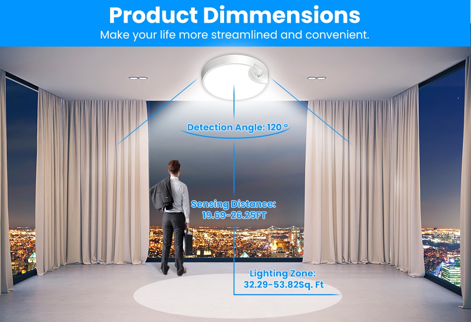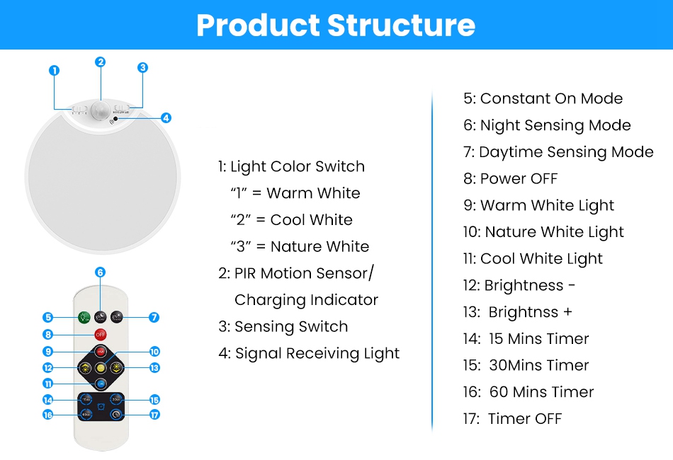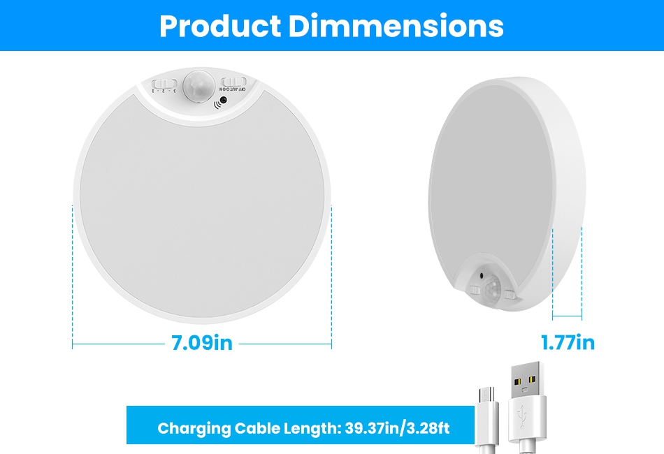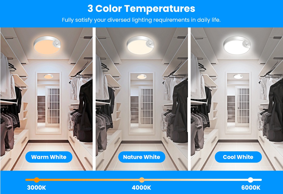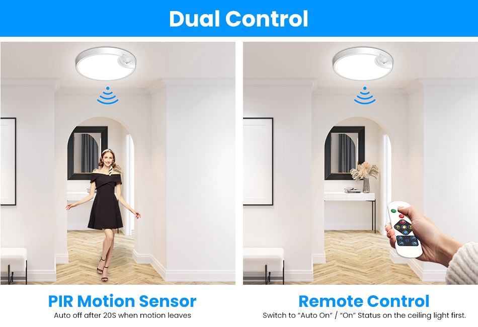 Designed with 3 color temperatures(6500K Cool White/3000K Natural White/4000K Warm White) and 10%- dimmable feature, our ceiling light allows you to customize you light at will. The PIR sensor, 3 lighting modes(Constant On Mode/Night Sensing Mode/Daytime Sensing Mode) and 3 timer settings(15/30/60 Minutes) make this LED ceiling light a perfect necessity at home, making your life more streamlined and convenient. The remote control enables you to tailor the light much more easily. USB rechargeable and longlasting for 12 months’ normal use. Ideal for hallway, closet, living room, pantry, bathroom, stairway, basement, bedroom, porch, shed, wall and many more commercial or residential applications. Features: