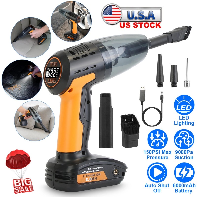Free Shipping Featured Item Product Detail Image GalleryProduct DescriptionOverview: This multifunctional device that combines the convenience of vacuum cleaning and tire inflation is designed to make your on-the-go tasks easier and more efficient. With 5 different inflation modes available, including options for ball, bicycle, motorcycle, car, and SUV, you can easily choose the right setting for your needs. High-efficiency motor supports powerful 9000Pa suction for effective dirt and debris collection. Cordless operation powered by a 6000mAh rechargeable battery for up to 40 minutes of no-load working time. The ultimate assistant for all your automotive needs. Features: