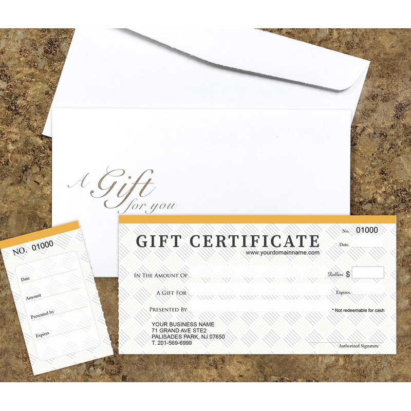 - 25, 50 or 100 pcs set of custom gift certificates (printed on 14pt classic matte paper) with matching envelopes.