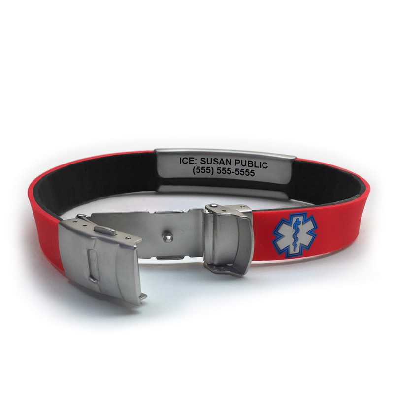 - This fully waterproof silicone medical alert ID bracelet has a matte finished stainless steel engraving plate and buckle clasp combining all the best for both form and function