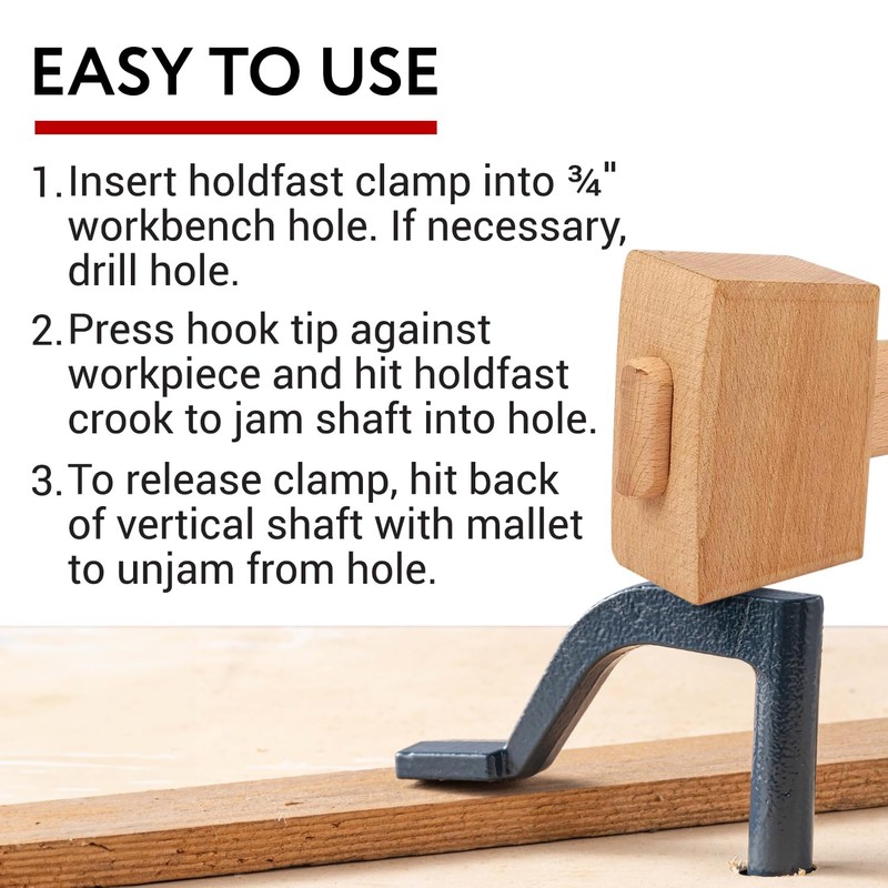 - Value 3 Pack –– Unleash your woodworking potential with this forged holdfast clamps value pack. Boasting an 8" length, 3.5” reach and a 3/4" diameter shaft, these bench holdfast clamps offer the right blend of size and power. Designed with ease of use in mind, the hold down dog clamp has a strong hold but effortless release