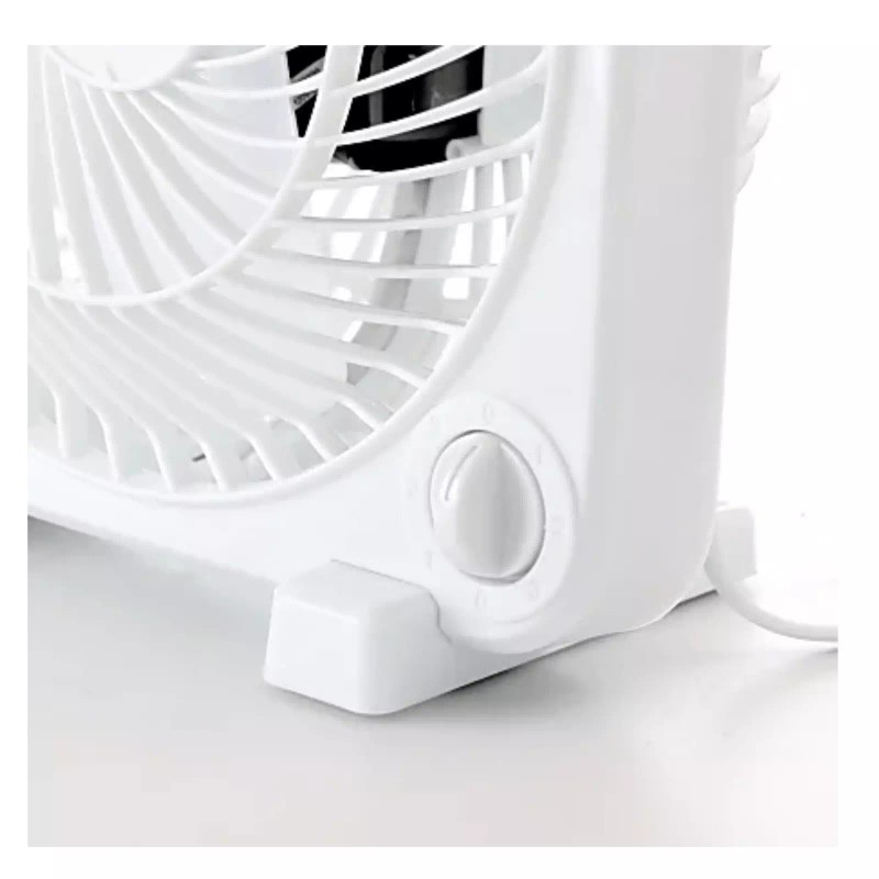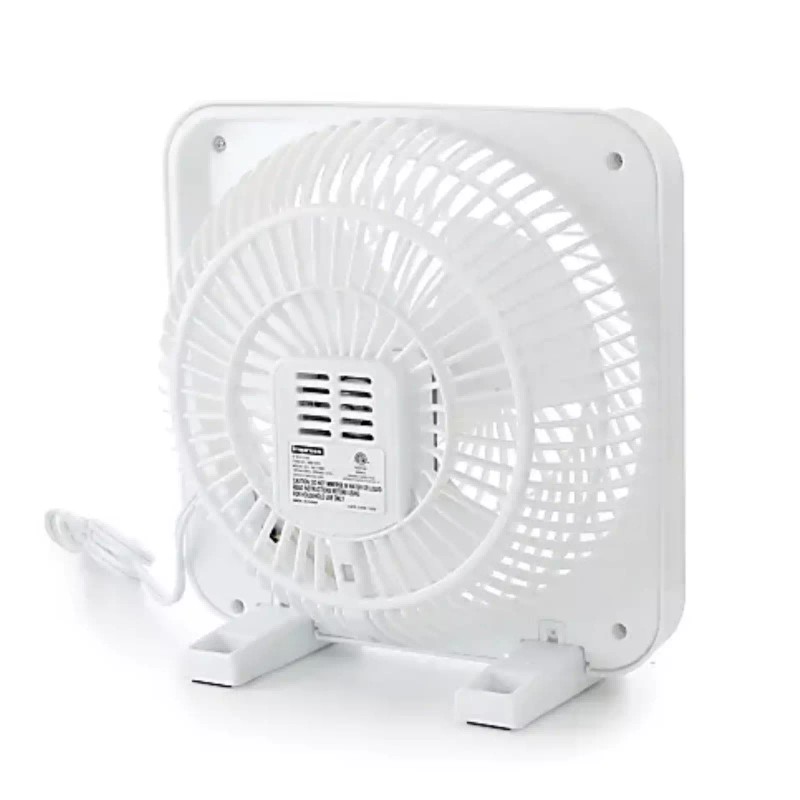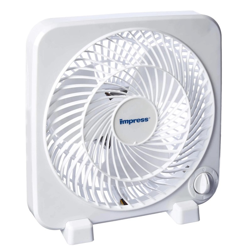 Enjoy a cool breeze any time of day with this Impress 9" Box Fan. It's made of polycarbonate and has raised feet that let you place it on any flat surface. This 3-speed box fan has an easy-to-use rotary dial. It also produces a whisper-quiet sound that will not disturb others around you. The compact and portable design makes it suitable for use in your home, office, and dorm room, as well as for travel.
