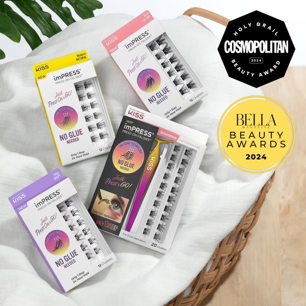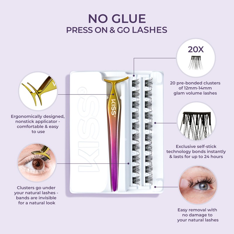 Lash in a flash! NEW instant gratification, 100% fuss-free lashes are here! imPRESS Press-On Falsies, the first ever press-on under lash application, allow you to press on a lash extension look in only 1-step. Five seconds to flawless! Mistake-proof, no glue needed, just press & GO. Pressure sensitive adhesive adheres instantly & lasts up to 24-hours. Unlike strip lashes, these are clusters of falsies you place under your natural lashes, so the bands are invisible, and the look is super natural. Theres no damage to your natural lashes and no sticky residue to remove. Press It and Forget It! Kit includes 20 pre-bonded clusters (enough for 2-3 applications) and a new, innovative non-stick applicator.