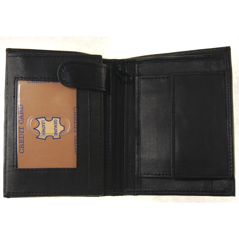 This unique men's bifold wallet with a leather snap fixed fold out window and credit card holder when closed looks like a bifold yet when open the room of a trifold. The tour of this wallet is as follows: Right internal side has a coin pocket with snap and slot. Middle internal zipper which gives access to both sides. Left internal side has a window ID that is held with a fixed leather snap that open to 2 more window ID and 8 horizontal credit card slots . You will also find 2 more slots behind the credit card slots. For bill currency their are 2 slots when the wallet is fully open. Comes in a free organza gift bag.