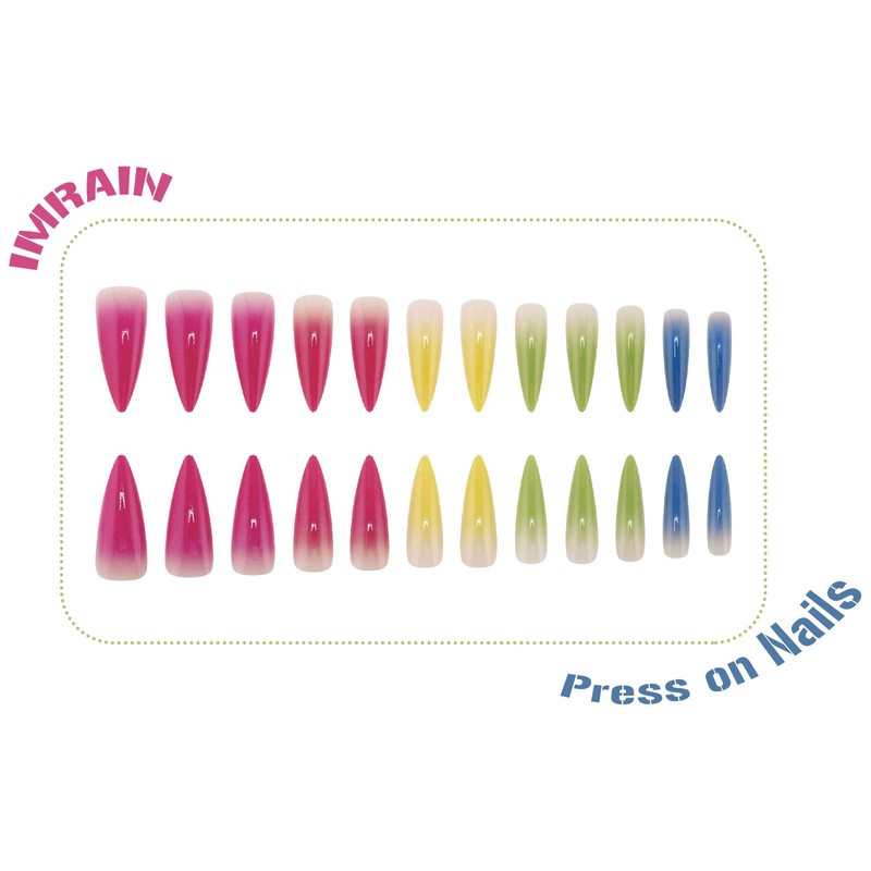 IMRAIN Colorful Ombre Press on Nails Long Stiletto Fake Nails Gradient Artificial False Nails Glossy Pink, Yellow, Green, Blue Acrylic Nails Glue on Nails Full Cover Spring Stick on Nails