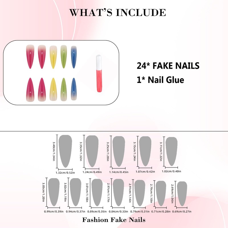 - [Quality Material] These colorful gradient press on nails are made of quality acrylic material, gentle to your nails and skin, not easy to be scratched, will give you a nice manicure experience.