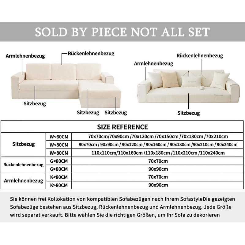 - Sold per piece/not all set: this sofa cover consists of many pieces in different sizes. If you need to cover the whole sofa, you need to buy many pieces of sofa covers in different sizes. Please measure the size of your sofa carefully before purchasing. If you don't know how to measure and buy it, please feel free to contact us. We are very willing to help you.