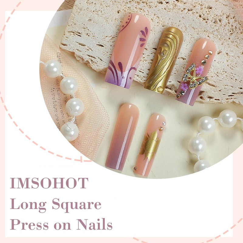 - [Package Content] You will get 24 pieces of IMSOHOT long square press on nails, a small clear box with glue, and you can trim it to any length you want~
