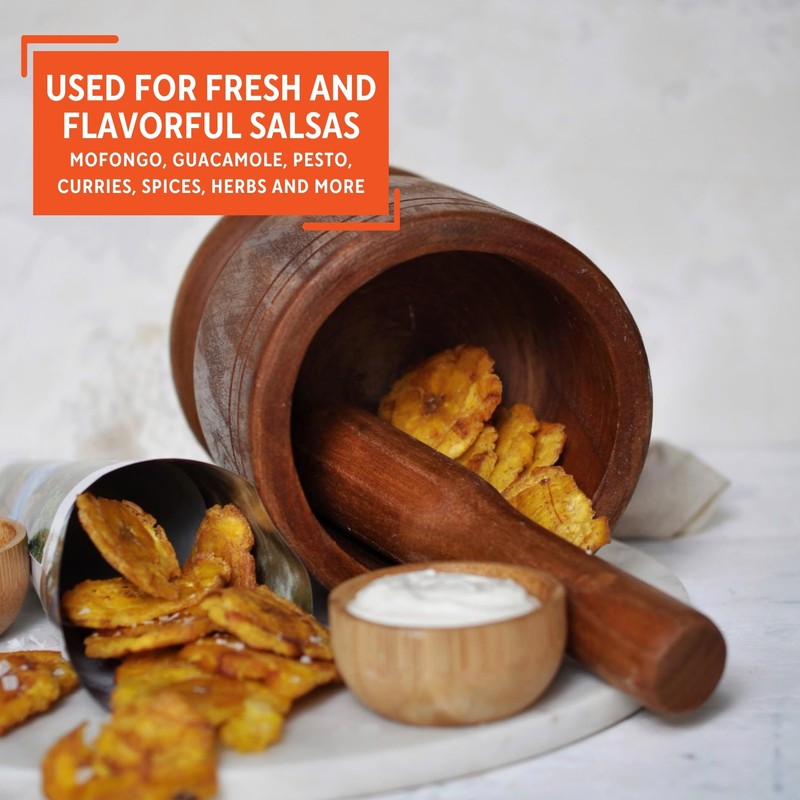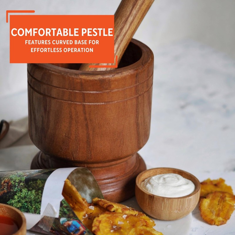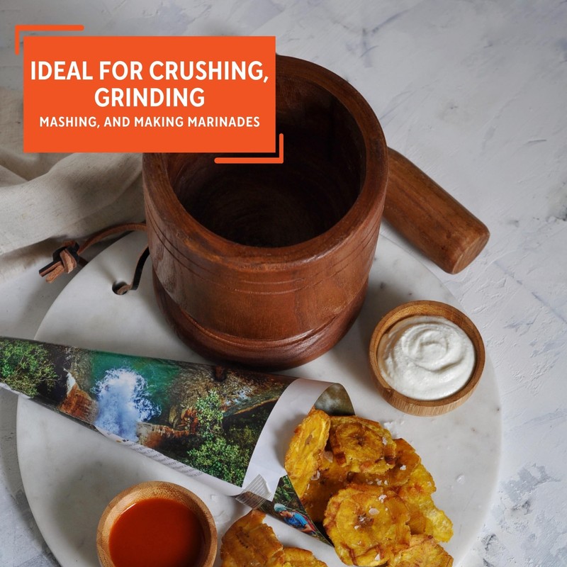The IMUSA Jumbo Wood Mortar & Pestle, boasting a substantial diameter of 5 inches, is a culinary powerhouse made from natural polished wood. Its jumbo size and high walls not only offer extra capacity but also provide exceptional comfort during use. This kitchen essential is easy to clean and use, showcasing a seamless blend of functionality and aesthetic appeal that transitions effortlessly from kitchen to table. Designed with versatility in mind, this mortar and pestle are perfect for preparing an array of dishes. From the traditional mofongo and mangu to guacamole, salsas, pesto, curries, and a variety of spices, herbs, garlic, ginger, vanilla, and pepper, this tool is a go-to for enhancing flavors in your culinary creations. Its multipurpose nature extends to crushing, grinding, mashing, and making marinades, catering to a range of cooking needs. The IMUSA Jumbo Wood Mortar & Pestle is an ideal choice for those who appreciate both the art and efficiency of handcrafted food preparation on a larger scale. Trust the IMUSA Jumbo Wood Mortar & Pestle as your go-to kitchen helper. It will surely become your kitchen's beloved companion simplifying and enhancing your culinary endeavors