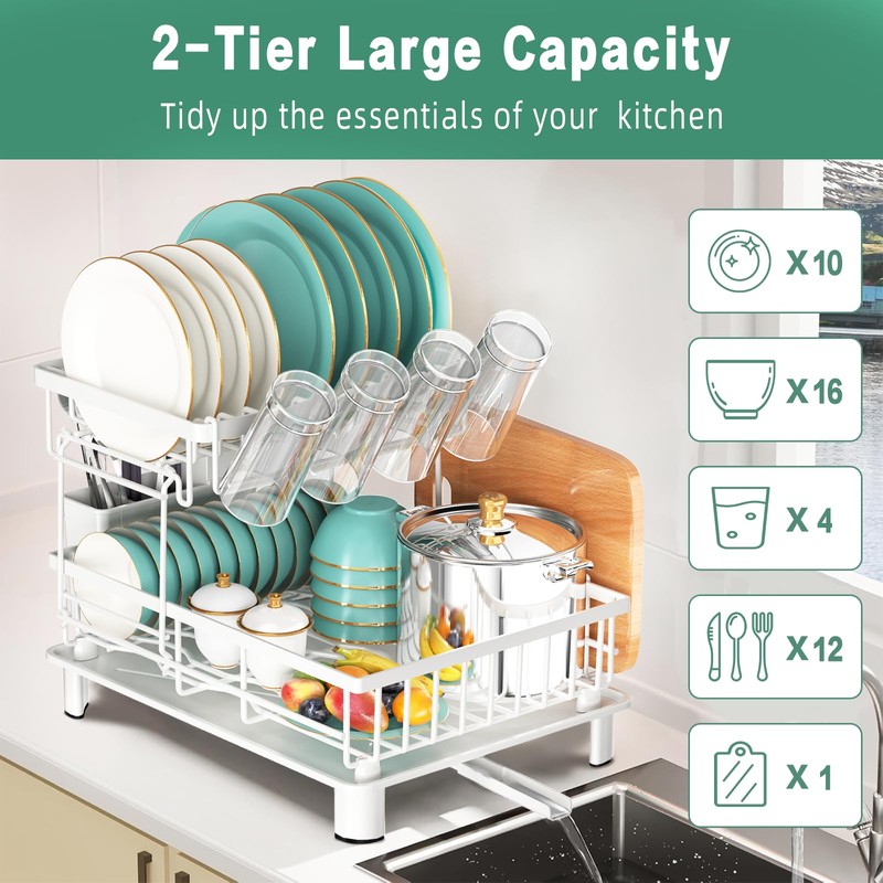 - 2 Tier Large Capacity Dish Rack:Our dish strainers for kitchen counter with drainboard measures 16.5" D x 13.4" W x 13" H. It comes with a plate rack, bowl rack, utensil holder, cup holder, and cutting board holder. You can store up to 10 individual plates, 16 bowls, 4 cups or glasses, 1 cutting board, and lots of other tableware. This dish drainer for the kitchen counter is crafted for space-saving and organizing your countertops
