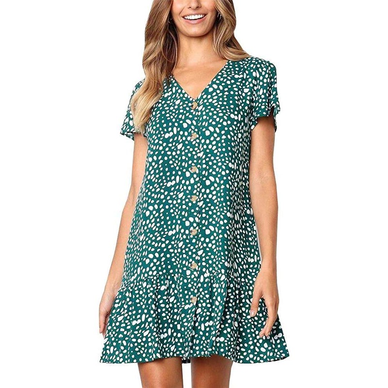 - Features: Polka dot, Ruffles hem, Button down, Short cap sleeve, Loose fit, Short dress