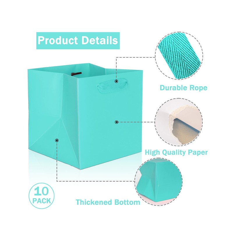 - Set Includes - Order contains a total of 10 pack 8x8x8 inch square gift bags with tissue paper, gift tags, teal blue color