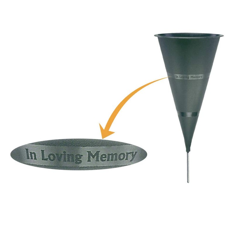 Beautify your loved one’s gravesite by adding a bouquet of live or artificial flowers to these cone-shaped, green plastic cemetery vases. Each vase features two satin bands and the embossed saying, “In Loving Memory”, on three sides of the cone. For easy placement, each vase comes with a built-in metal spike. The spike helps keep the vase upright in the desired location throughout each season.