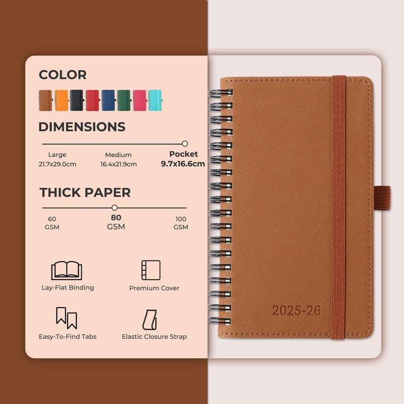 IN-LUXPRO 2025-2026 Academic Diary A6 Week to View (16.6x9.7 cm) Spiral 18 Months (Jul'25 - Dec'26) Weekly & Monthly Planner with Month Tabs & Pocket,Expenses/Note Pages,PU Leather(Brown)