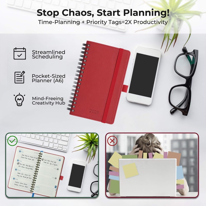 IN-LUXPRO Diary 2026 Planner: Spiral A6 Week to View (16.6x9.7 cm) 12 Months (Jan. - Dec.) Weekly & Monthly Planner with Month Tabs & Pocket Expenses/Note Pages 100GSM Paper PU Leather Red