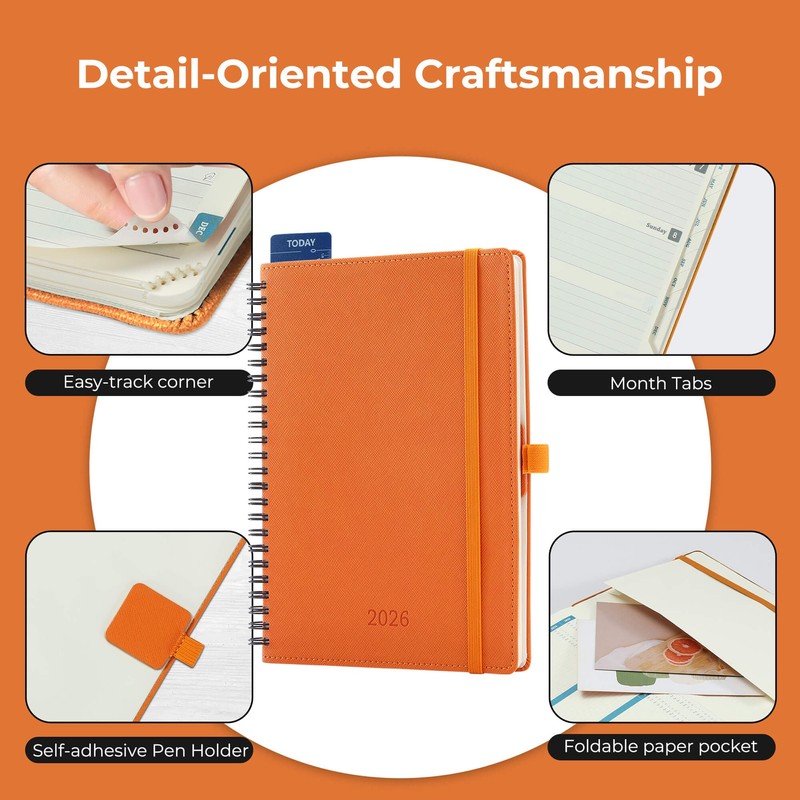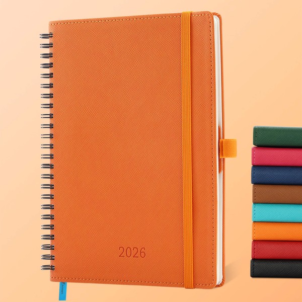 IN-LUXPRO Planner 2026 Daily Weekly and Monthly,8.5"x6.5",12 Months Spiral Bound Calendar Agenda with Self-adhesive Pen Holder,2026 Appointment Book with Vegan Leather Soft Cover,Orange