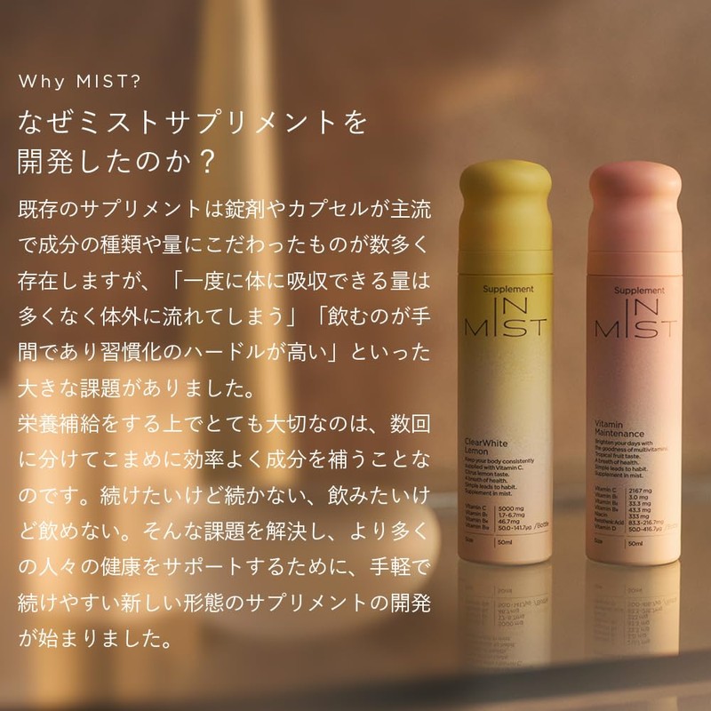 - 🟠IN MISTは、栄養をミスト状にして飲む新形態のサプリメント。水なしで、いつでもどこでも飲めて、ジュースのような美味しさだから「毎日飲めて、サプリメント習慣が長続き」。