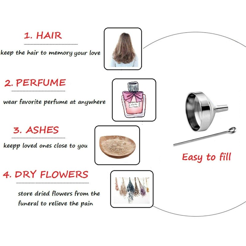 - 💖 MULTI-FUNCTION AND EASY TO USE 💖Funnel filler kit is included. It works perfectly for filling it with all kinds of things,like loved ones ashes,hair,nail,or other private items.Easy to fill human or pet's ashes. It is a cremation necklace, memorial locket, urn jewelry cremation, Keepsake pendant, cremation box,ashes holder and ashes necklace.