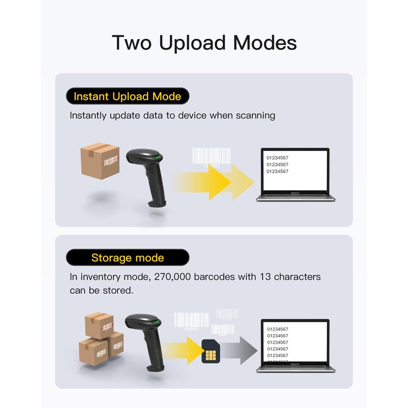 • Vibration and beep, and supports manual scan mode, continuous scan mode and hands-free mode, making it suitable for warehouses, convenience stores, libraries, etc. In inventory mode, 270,000 barcodes with a length of 13 characters can be saved